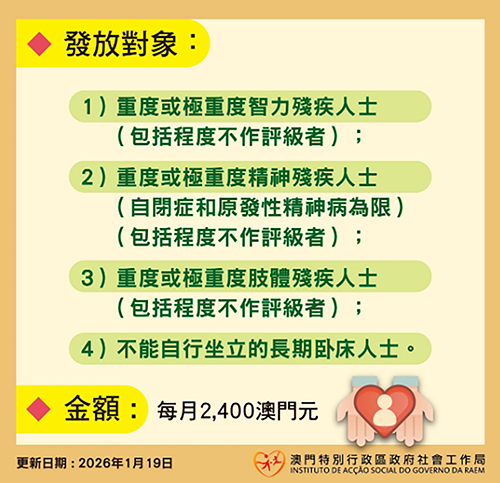 根據第139/2025號社會文化司司長批示,自本月起,照顧者津貼金額由每月2,175澳門元調升至2,400澳門元,面向對象為符合《照顧者津貼發放規章》所定要件的下列人士:重度或極重度智力殘疾人士、重度或極重度精神殘疾(自閉症/原發性精神病)人士、重度或極重度肢體殘疾人士,以及未滿4歲只作上述分類而不作分級者;還有因身體功能缺損而不能在沒有他人或外物輔助下坐立人士。此外,亦作出多項優化安排,包括:提高家團每月總收入上限、接受在橫琴粵澳深度合作區生活的澳門居民申請等。
