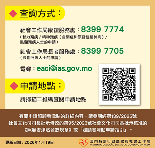 有關照顧者津貼的發放規章和申請表格等文件,可由今日起於社會工作局網頁 https://www.ias.gov.mo 下載。如有查詢,可電郵至eaci@ias.gov.mo,亦可致電以下電話:有關重度或極重度智力殘疾或精神殘疾(自閉症/原發性精神病)或肢體殘疾人士的申請,致電8399 7774社會工作局康復服務處;有關不能自行坐立的長期卧床人士的申請,致電8399 7705社會工作局長者服務處。