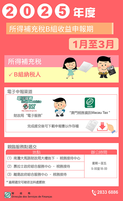 倘納稅人遞交紙本收益申報書,可於辦公時間內(星期一至五9:00-18:00)親臨財政局以下服務地點遞交:南灣財政局大樓地下 - 稅務接待中心;慕拉士政府綜合服務中心 - 稅務接待;離島政府綜合服務中心 - 稅務接待。如有疑問,可致電稅務查詢熱線2833 6886。