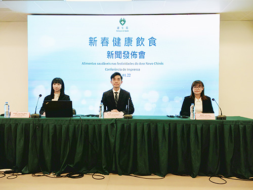 “新春健康飲食新聞發佈會” 昨日午3時在公共衛生應急人員宿舍五樓會議廳舉行,李宗煜與衛生局疾病預防及控制中心營養師葉嘉琪、衛生局塔石衛生中心營養師林若恆出席,介紹新春健康飲食“貼士”。