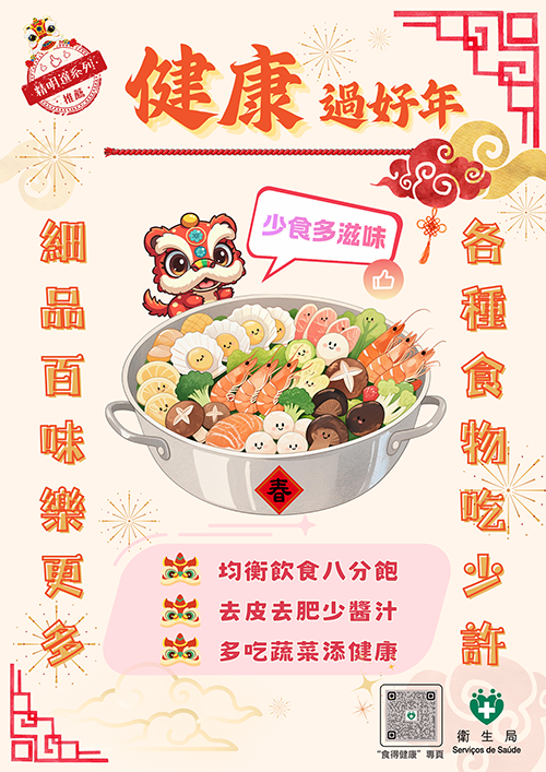 【本報訊】新春佳節將至,連串聚餐和應酬接踵而來,如不控制飲食,或對身體健康構成風險。衛生局昨日舉行“新春健康飲食新聞發佈會”,引導居民建立節日健康飲食觀,共建健康社區。出席發佈會的仁伯爵綜合醫院內科醫生李宗煜表示,隨著本澳踏入老齡化社會,居民飲食模式轉變以及外賣普及等因素,“三高”和肥胖問題呈年輕化趨勢。他稱,高鹽、高糖和過量飲食都會對健康造成影響,其中過量飲食在節慶期間較常見,建議八分飽即可,進食順序為“菜肉飯”,避免連續大魚大肉。