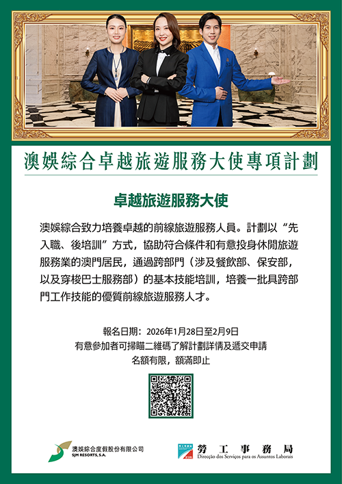 【本報訊】為回應澳門旅遊業發展需要,以及應對節假日期間旅客接待工作,勞工事務局和澳娛綜合度假股份有限公司(下稱“澳娛綜合”)合作推出“澳娛綜合卓越旅遊服務大使專項計劃”,以“先入職、後培訓方式”,培養一批具跨部門工作技能的前線旅遊服務人員。該計劃由今日起接受網上申請。
