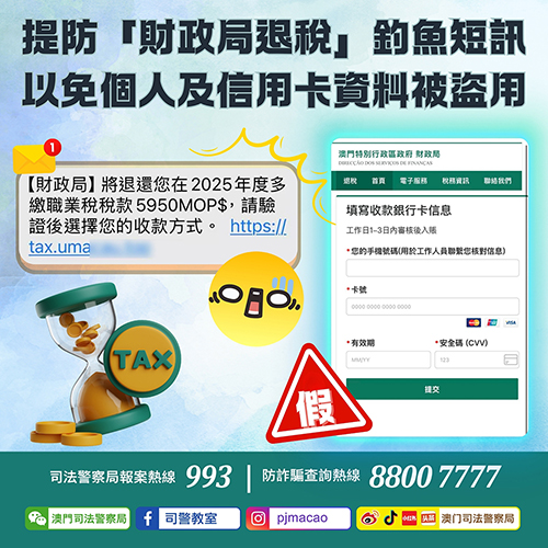 【本報訊】司法警察局發現,有騙徒假冒“財政局”名義隨機向市民發送釣魚短訊,短訊內容訛稱“退還您在2025年度多繳職業稅稅款”,並誘導市民點擊短訊內附帶的連結以選擇收款方式。若市民不慎點擊該連結,將會進入一個假冒“財政局”的釣魚網站。該網站會要求市民填寫姓名、手機號碼、身份證等個人資訊,並要求輸入信用卡號碼、有效期限及安全碼等資料進行驗證。一旦騙徒成功盜取相關資料後,便會利用這些資料進行未經授權的大額交易。