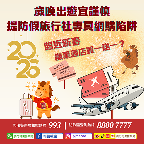 司警局反詐騙協調中心提醒市民:1. 切勿輕信社交平台上遠低於市價的商品廣告,避免與來歷不明的網上賬戶進行交易;2. 購買旅遊產品應選擇信譽良好的機構,並透過官方正式渠道交易;3. 如有任何懷疑,可使用司警局“反詐程式”查核風險指數,或致電防詐騙查詢熱線 8800 7777 或報案熱線 993 求助。