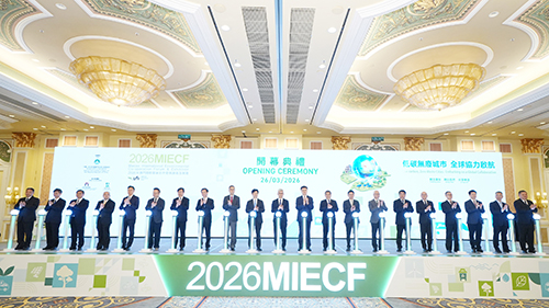 2026MIECF開幕典禮由行政長官代表、經濟財政司司長戴建業,中聯辦副主任呂玉印,國家生態環境部代表、“一帶一路”綠色發展國際聯盟理事長趙英民,外交部駐澳門特派員公署署理特派員程雷,湖南省省委常委、常務副省長王道席,廣東省副省長張少康,廣西壯族自治區副主席曹志強,以及運輸工務司司長譚偉文等擔任主禮嘉賓。