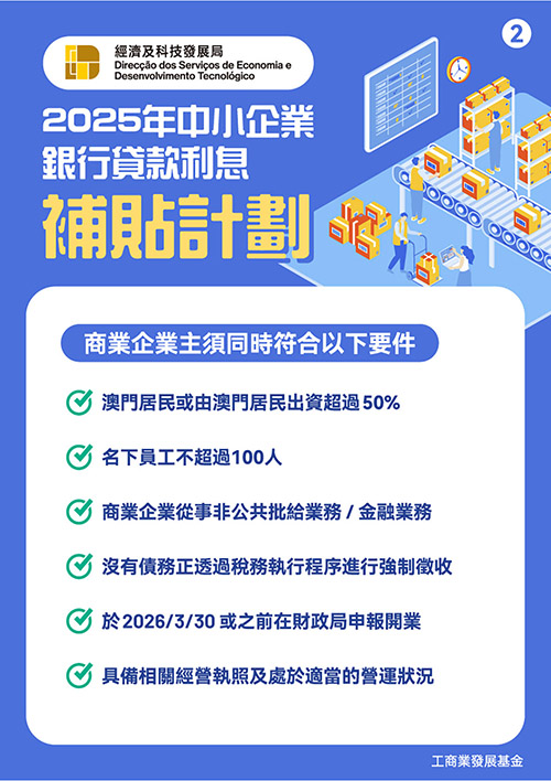 特區政府於去年4月22日推出中小企業銀行貸款利息補貼計劃,以貸款利息補貼的方式向中小企業提供資助,減輕融資成本,支持企業補充資金流,增強抗風險能力。為擴大受惠企業範圍,當局已將“2025利息補貼計劃”申請對象的資格條件調整為“於2026年3月30日或之前已向財政局申報開業的商業企業”。符合資格的中小企業,凡獲得由澳門持牌銀行批准用於企業營運的資金貸款,可透過銀行申請貸款利息補貼,每一商業企業主的貸款額上限為500萬澳門元,補貼期最長3年,年補貼率上限4厘,銀行貸款額總額上限100億澳門元。