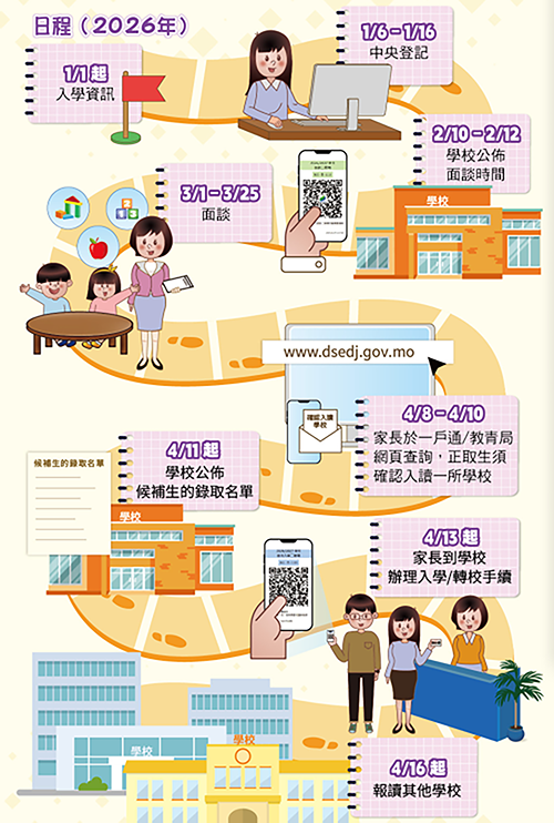 【本報訊】教育及青年發展局提醒完成幼兒首次入學中央登記的幼兒家長,須留意2026/2027學年發佈錄取及辦理手續的日程安排,正取生須“網上先確認,再到校辦手續”。教青局和學校將於下週三(8日)公佈正取生錄取名單,家長按已登記的方式登入一戶通/教青局“幼兒首次入學中央登記措施”專題網頁(www.dsedj.gov.mo),便可查詢正取生的錄取情況,並取得“首次入學二維碼”,正取生和候補生的家長需截圖備用作辦理首次入學手續。