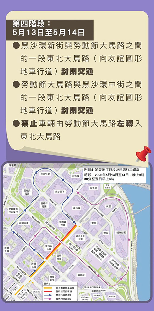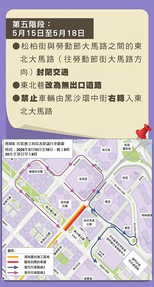 根據交通事務局公佈的相關交通管制措施,3月30日至4月9日及4月23日至5月12日夜間時段(晚上9時30分至翌日早上6時,下同),黑沙環中街與勞動節大馬路之間的東北大馬路實施有限度通車;4月10日至14日夜間時段,黑沙環新街與勞動節大馬路之間的東北大馬路(向友誼圓形地車行道)及勞動節大馬路與黑沙環中街之間的一段東北大馬路(往友誼圓形地方向)實施封閉交通,東北大馬路與東方明珠街之間的一段黑沙環中街改為無出口道路,禁止車輛由勞動節大馬路左轉入東北大馬路,而行經相關路段的車輛需繞道;4月15日至22日夜間時段,東北大馬路近松柏街的路段(向澳門日報車行道)實施封閉交通,禁止車輛由黑沙環中街右轉入東北大馬路,行經相關路段的車輛需繞道;5月13日至14日夜間時段,黑沙環新街與勞動節大馬路之間的一段東北大馬路(向友誼圓形地車行道)及勞動節大馬路與黑沙環中街之間的一段東北大馬路(向友誼圓形地車行道)實施封閉交通,禁止車輛由勞動節大馬路左轉入東北大馬路,行經相關路段的車輛需繞道;5月15日至18日夜間時段,松柏街與勞動節大馬路之間的東北大馬路(往勞動節街大馬路方向)實施封閉交通,東北巷改為無出口道路,禁止車輛由黑沙環中街右轉入東北大馬路,行經相關路段的車輛需繞道。
