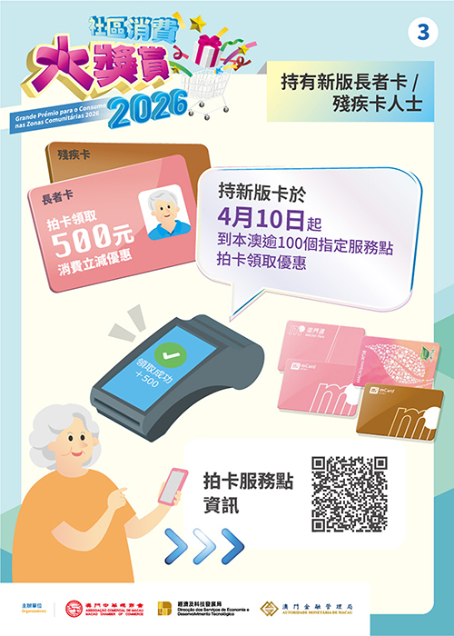 此外,長者及持殘評證人士繼續享有額外500元的“消費立減優惠”,合資格人士須持有效澳門通“長者卡”或“殘疾卡”,在本澳逾100個指定服務地點拍卡領取優惠。卡式消費立減優惠不設每日使用上限,活動期內週一至週日均可使用,交易時系統會自動以立減優惠扣減交易金額的一半(50%),餘下的一半(50%)金額從持卡人自行充值的餘額中扣除。未使用的立減優惠將於活動結束後清零,自行注資的餘額則不受影響。據經濟及科技發展局公佈,截至本月11日,已有逾5.8萬名居民完成領取卡式消費立減優惠。